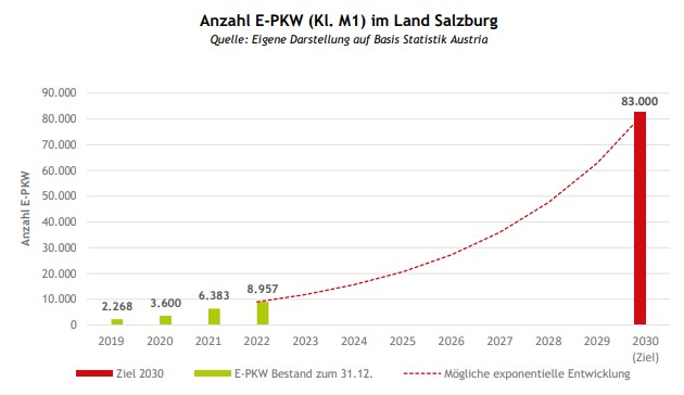 E-Mobilität allein wird die Verkehrsprobleme Salzburgs nicht lösen. Notwendig ist ein viel stärkerer Umstieg auf den ÖV sowie das Fahrrad. Aber auch in der Zulassung von E-Autos sind wir noch immer am Anfang. Nur 2,7 Prozent der PKW-Flotte waren 2022 elektrifiziert, das entspricht ca. 8900 E-Autos – bis 2030 ist im Masterplan eine Verzehnfachung auf 83.000 E-Fahrzeuge vorgesehen.