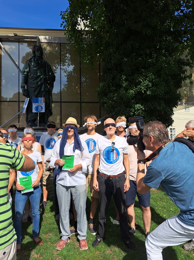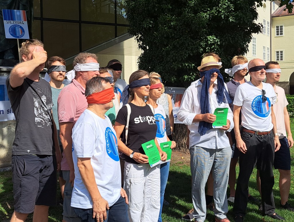 „Öffnet endlich die Augen“ – Unter diesem Motto forderten Mitglieder von Scientists for Future Salzburg in einer Aktion am 18. August eine energischere Klimapolitik ein. Symbolhaft verbanden sie sich und der Statue von Friedrich Schiller am Eingang zum Furtwänglerpark die Augen mit einem Tuch. So wie UN-Generalsekretär Antonio Guterres mahnen die Salzburger Wissenschaftler und Wissenschaftlerinnen konkretere Maßnahmen der Politik zur Eindämmung der Klimakrise ein. Neben der Politik seien wir aber auch als Bürger und Bürgerinnen gefordert, unser Mobilitäts- und Konsumverhalten umgehend zu verändern. Beispiele, wie das geht, gebe es bereits genug. Die Aktion ist Teil einer weltweiten Kampagne in zahlreichen Städten unter dem Motto „Tell the Truth“, in der Statuen berühmter Persönlichkeiten die Augen verbunden werden. Die WissenschaftsaktivistInnen nehmen Bezug auf den Vers von Friedrich Schiller:„Was ist das Schwerste von allem? Was dir das Leichteste dünkt, mit den Augen zu sehn, was vor den Augen dir liegt.“Ihr Aufruf: „Öffnen wir die Augen und handeln danach! Die Klimakrise erlaubt keinen Aufschub mehr.“