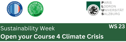 Die „Open your Course 4 Climate Crisis“ ist eine Woche, in der Hochschullehrende aufgefordert sind, das Thema Nachhaltigkeit und Klimawandel fachspezifisch in ihren Lehrveranstaltungen zu integrieren. In Salzburg findet gleichzeitig die Sustainability Week statt, in der man sich vernetzen kann und einen Überblick bekommt was es zu den Themen in Salzburg schon alles gibt. Es gibt Programmpunkte wie interessante LVAs zum Reinschnuppern, Informationsstände, offene Kennenlern-Treffen, Slams u.v.m. Hier geht es zum Programm (kann noch erweitert werden):