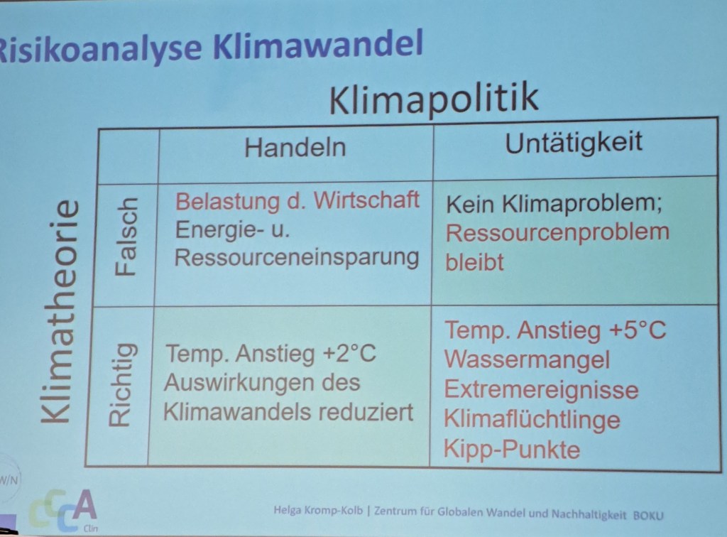 Kromp-Kolb verwies auf einen für alle „Skeptiker“ essenziellen Aspekt hin. Angenommen, die Mehrheit der WissenschaftlerInnen weltweit würde sich irren und es gibt gar keinen vom Menschen gemachten Klimawandel. Trotzdem bleiben alle Maßnahmen der Ressourcenvermeidung und des Umweltschutzes sinnvoll. Der „Schaden“ wäre gering. Diametral anders ist es allerdings, wenn die Annahmen der Wissenschaft stimmen, und man trotzdem nichts oder zu wenig tut. Das würde in einer Katastrophe münden. Die Menschheit hat die Wahl. (siehe Grafik).
