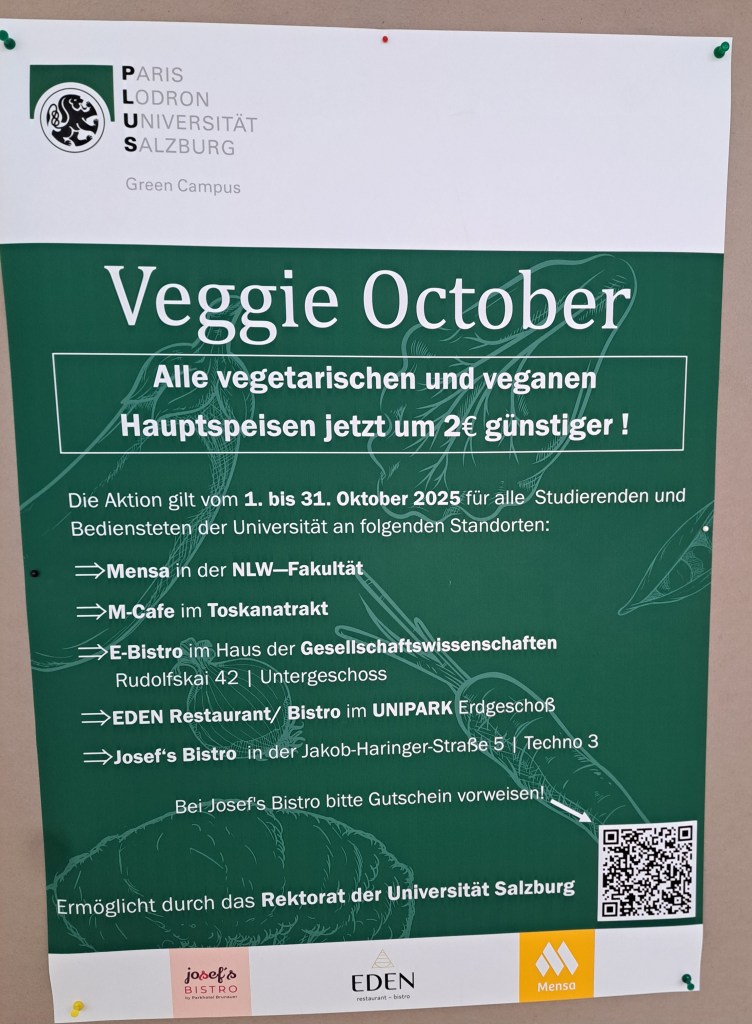 Am 29. September trafen sich Mitglieder der Scientists for Future Salzburg zum Jour Fixe an der Natur- und Lebenswissenschaftlichen Fakultät der Universität Salzburg (NLW). Hier einige Infos und Hinweise aus dem Treffen, die auch für Nicht-Universitätsangehörige von Interesse sein können. PS: Das Foto oben gibt den Eingang zum Universitätsgebäude wider, das derzeit mit den Sustainable Development Goals „beflaggt“ ist. Jenes ganz unten informiert über den Veggiemonat Oktober an den Mensen, der von den S4F mitangestoßen wurde.