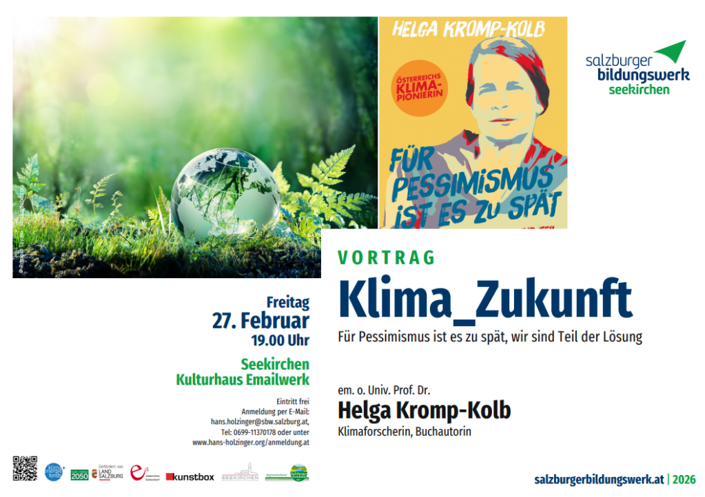 Helga Kromp-Kolb ist eine herausragende österreichische Klimaforscherin, die sich seit Jahrzehnten mit den Herausforderungen und Lösungen des Klimawandels beschäftigt. Als emeritierte Professorin für Meteorologie und Klimatologie an der Universität für Bodenkultur Wien hat sie einen bedeutenden Beitrag zur Erforschung des Klimawandels und seiner Auswirkungen auf Umwelt und Gesellschaft geleistet. Ihr Engagement für nachhaltige Entwicklung und ihre Expertise in der Klimaforschung machen sie zu einer wichtigen Stimme in der aktuellen Debatte über Klimaschutz und soziale Gerechtigkeit. In ihrem Vortrag wird sie Vorschläge bezugnehmend auf ihr aktuelles Buch „Für Pessimismus ist es zu spät“ dazu bringen, was jetzt zu tun ist, was Aufgabe der Politik ist und was jede/r Einzelne tun kann. Referentin: em. Prof.in Dr.in Helga Kromp-Kolb (Klimaforscherin, Autorin) Termin: Fr. 27. Februar 2026, 19.00 Uhr Beginn: 19.00 Uhr, freier Eintritt Ort: Emailwerk Seekirchen, Windhagerstraße 7. Der Saal ist barrierefrei und mt öffentlichen Verkehrsmitteln erreichbar. Die Veranstaltung findet als Green Event statt. Eine Kooperation von Bildungswerk Seekirchen, e-5-Gemeinden Köstendorf und Seekirchen, Regionalverband Salzburger Seenland und Kulturverein Kunstbox Seekirchen Anmeldung
