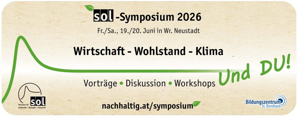 Gerne weisen wir auf das nächste SOL-Symposium hin, das vom 19.-20 Juni 2026 im Bildungszentrum St. Bernhard in Wiener Neustadt stattfindet. Es referieren Judith Derndorfer, Ökonomin und arbeitet als Referentin für Verteilungsfragen und Feministischer Ökonomie in der Abteilung Wirtschaftswissenschaften und Statistik der AK, Ilona Otto, Professorin für Gesellschaftliche Auswirkungen des Klimawandels am Wegener Center für Klima und Globalen Wandel an der Universität Graz, Aaron Sterniczky, Professor an der Deutschen Hochschule für Angewandte Wissenschaften, Potsdam, sowie Hans Holzinger, Wirtschafts- und Sozialgeograph, Senior Adviser der Robert-Jungk-Bibliothek für Zukunftsfragen, Autor mehrerer Bücher, zuletzt „Von nichts zu viel, für alle genug“, „Wirtschaftswende“. Zudem gibt es spannende Workshops und Gespräche.