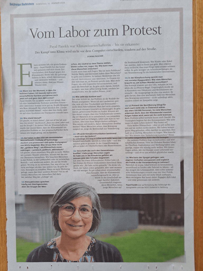 Am 10. Jänner erschien ein schönes Interview von Dorina Pascher mit Payal Parekh, Referentin eines Workshops des AK „Klima & Nachhaltigkeit“ des Salzburger Bildungswerks gemeinsam mit Südwind Salzburg, dem Friedensbüro und den Scientists for Future. Das Thema: Wie Klimathemen richtig kommunizieren?